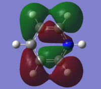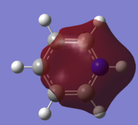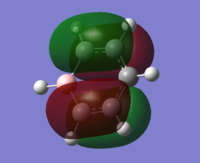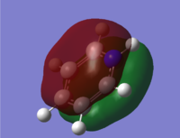 the molecules HOMO's and HOMO-1 have nodal planes into the ring and a nodal plane perpendicular to the ring. the benzene molecule has a double degenerate HOMO as does the borazine since they both have the same symmetry. since the symmetry changed with boratabenzene and pryidium this becomes no longer true since the boron atom subsitution raises the moecules energy in boratabenzene and the subsiution of nitrogen in pyridum lowers the enrgy.