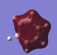 boratabenzene's HOMO-1 orbital is higher in energy than the HOMO since it has a node in the boron atom and electron density across the boron atom in the HOMO, this makes it destabiised since boron is an electropostive atom. the negative charge assigned to the boratabenzene means that there is a high electron density near the boron atom in the HOMO. the reasoning behind the negative charges on the carbon atoms in the ring are due to borons electron donating ability, meaning the carbons closest to the boron will have a greater electron density giving a asymetric distrubtion of elecron density.