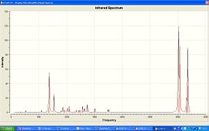 The vibration of the C-Cl bond in the Dicarbene is 772.634cm-1, the hydrogenated product has a high frequency of 782.383cm-1, this shows that the Cl-C bond in this case is more free to move. The Dicarbene has 2 vibrations for the C=C bond, one with the Cl closest to it being a higher frequency, 1760.91cm-1, and the one furthest away being of lower frequency 1740.79cm-1. As the hydrated verision only has one C=C bond there is only one vibrational frequency at 1757.6cm-1.