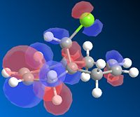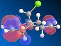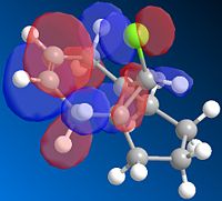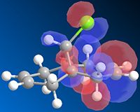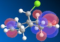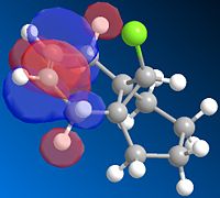 The first minimisation ran and the energy was found to be 17.9kcal/mol, the energy measured from HF/STO-3G is -873.6 Hartree/548182.95 Kcal/Mol and from the B3LYP/6-31G(d)method the energy was caculated to be -887.1Hartree. These energies are completely different. In the the difference in the optimised structures is seen when looked down the bond which is shared by the a rings, the alkene carbons on the same ring as the chlorine are pointing further down on the quantum mechanical model than on the classical. It shows that the quantum mechanical approach has taken into account the repulsion of the large chlorine electron cloud with that of the alkene pi-cloud.