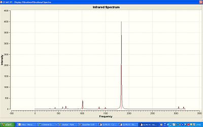 Compared with the lit4 values of 3534, 3464, 34634, 1765, 1765,and 1139cm-1 the computed frequencies are far out for some of the vibrations, for instance the 2 degenerate orbitals 5 and 6 are actually 4 and 5 in the lit values, and they are out by 200cm-1. The other degenerate vibrations are only out by 30cm-1, this was a good approximation for them, and also for vibration 4(on guassview)/6(from lit) 3534cm-1 and 3551cm-1 are only out by 17 wavenumbers! the first vibration however is about 100 wavenumbers out. The computer can generate a resonable prediction of the IR spectrum but not accurate numbers.