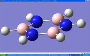 Ammonium borane is used as a way of storing hydrogen. It has a high content of hydrogen in it and is quite stable as a solid at room temp. It has a strong N-B bond making hydrogen evolution more desirable over N-B bond breakning. The by-product of hydrogen evolution is borazine – isoelectronic to benzene. The eclipsed and staggered conformations were optimised, first using B3LYP with a basis set of 3-21G, and then a higher set of MP2 and 6-311G(d,p) to increase the accuracy. The difference between the accuracy was around 0.2au –this correlates to 525kJ/mol, which is quite a difference!