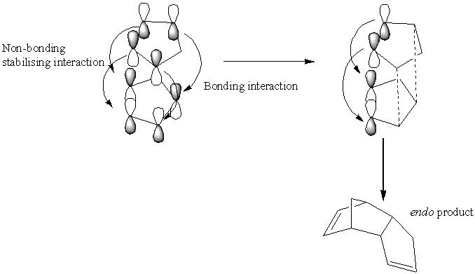 The endo rule can be rationalised in the following way. Drawing the orbitals of the two components as they come together shows the orbitals that form the new σ-bond as well as an additional set of orbitals, which can form a bonding interaction. These do not form an actual bond but stabilise the molecule in a way not present in the exo product[2] even though the exo product is more thermodynamically stable. If the reaction is reversible, the exo product product is formed.