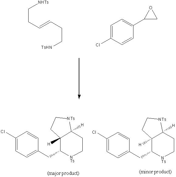 The reaction of aryl epoxides with (E)-hex-3-ene-1,6-ditosylamide in the presence of p-TSA in dichloroethane can, in principle, give two isomeric products, one in which the two hydrogens on the fused ring aretrans (major product) and another where they are cis (minor product.)[13] These two isomers are easily differentiated by their 1H NMR spectra and coupling constants.