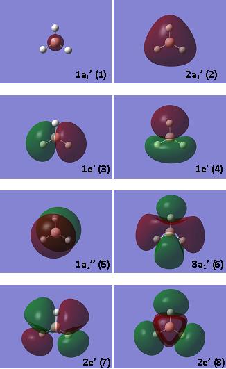 The first four listed orbitals are the occupied orbitals (two per orbital.) The fourth listed shows 100% s character localised on the boron atom. This suggests that it is the low lying 1s orbital (missed out in the LCAO picture above), which does not interact at all with the H3 fragment. Orbitals 1,2 and 3 show 33.33% s character and 66.67% p character, which corresponds to the well known hybridisation state, sp2. This is completely in line with what is expected, both from LCAO and from VSEPR theory. Looking further down the .log file, it can be seen that the eighth orbital listed has the lowest energy of all of the unoccupied orbitals.