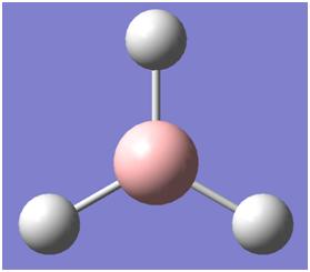 A molecule of BH3 was drawn using GaussView (fig. 1.) The initial drawing of the molecule was set such that the dihedral angles were set to 120o and the boron hydrogen separation was 1.5 Å. This was to assist the subsequent geometry optimisation in finding the lowest energy of the system.