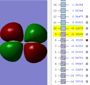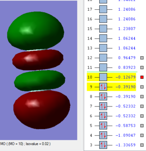 This image shows an antibonding pi molecular orbital. It is made with the two 2px atomic orbitals of the fluorine atoms. This is the LUMO.