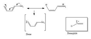 In this Diels-Alder reaction the symmetry plane through each molecule means there is no constraint on which end of the fragment reacts where. When substituents are added to either the diene or dienophile a polarity is introduced into the fragment. In this example a amine (Electron donating group) and a chlorine atom (electron withdrawing group) are added asymmetrically. The figure right shows the induced polarity of the fragment orbitals. Fragments with an intrinsic polarity such as those in figure 8 require that these polarities are matched, this is something that must be considered in the first guess of the transition state.