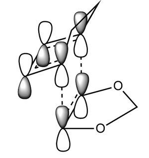 MO theory allows us to describe this reaction as a inverse demand Diels-Alder cycloaddition. The dienophile, dioxale fragment, is electron rich due to an increased electron density via the oxygen hetero atom. As a result of this increase in electron density on dienophile, the moleculer orbital energy is increased. This increase means that the pi bonding orbital is shifted above the HOMO of the diene and thus becomes the HOMO of both fragments. This is known as inverse electron demand.