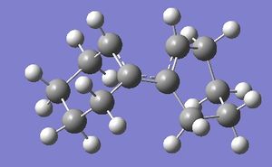 Next the carbon carbon bond that is formed in the reaction was broken and the distance was set to 2.0 angstrom (any distance greater pushed the rings apart and was not close enough to induce the transition state, the actual transition state had a bond length of 2.3 angstrom). This was minimised to a minimum with the bonds frozen. This gave a single negative frequency. The structure was then unfrozen and optimised to the Berny transition state. For the first few runs this yielded 2 negative frequencies. The symmetry of the minimised molecule was slightly altered via the dihedral and the structure was reoptimised to transition state yielding only 1 negative frequency corresponding the correct stretches. It was also important to ensure the hydrogens on the frontier carbons were on the same face. IRC of this reaction was run, this was a length procedure due to the amount of optimisations required to get to the energy minima. To observe how the orbitals move and twist from reactants to products, points were chosen along this path and single point energy calculations were run to visualise how the orbitals change and categorise the reaction as con vs syn (as well as the gif below of the reaction). At first I was surprised that the two cyclohexane rings should share the same face however this is a necessary requirement due to the hydrogens needing to be on the same face (the cyclohexane are conrotation).