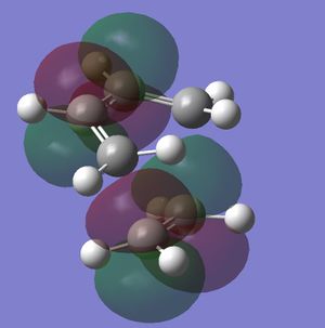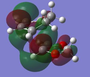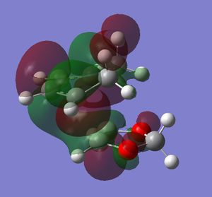 For this exercise method 2 as described in the introduction was used. As a typical diels alder a good guess can be made about the transition state. One of the requirements for this concerted pericyclic reaction is that at the transition state the frontier p orbitals are above / below each other figure 3. (Fv611 (talk) Also needs a reference.) From this knowledge of the diels alder transition state a good initial guess of the transition can be made. Once the guess structure was drawn the gaps between the frontier carbons, where bonds were to be formed were positioned around the van der waals radius distance apart (table 3) and the bonds were frozen to prevent the fragments from moving apart and reforming reactants. The structure was optimised to a minimum to optimise the fragments geometries of the suspected transition state. Once optimised the bonds were unfrozen and the molecule was optimised to a berny transition state (Fv611 (talk) Berny is the name of the algorithm used by Gaussian for the optimisation, not a type of Transition State.). To ensure that the transition state was reached the frequencies were changed the vibrations of the fragment were checked. (Fv611 (talk) It is unclear what you mean by "the frequencies were changed".) The transition state should and did have a negative (imaginary) frequency at roughly 950 cm-1 when this vibration was animated it corresponded to the vibration towards the products which is expected as it is the vibration on the surface that goes down the potential slope towards the products rather than up in energy like the other vibrations.