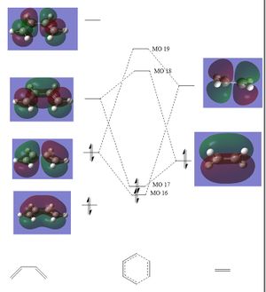 In this exercise we react a diene (butadiene, typical for these type of reactions) and a dieneaphile (ethene) as a concerted 2+4 cycloaddition figure 2 below.