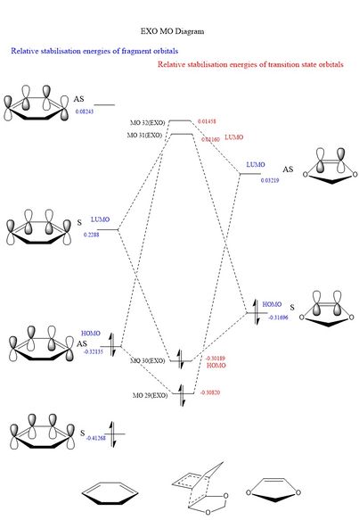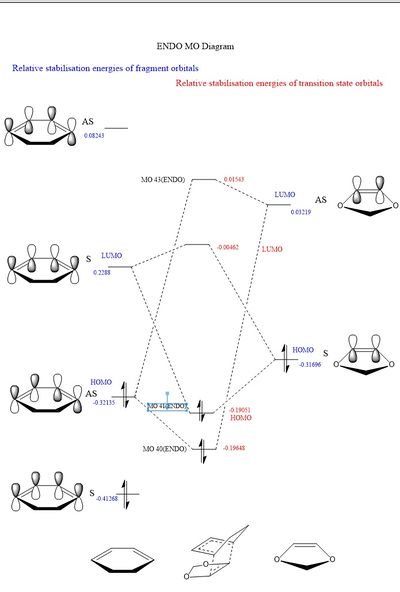 In the second excercise the effects of using a diene with a electron donating hetero atom are investigating and investigating the affect of this on the electron demand of the molecular orbitals. Another feature of the Diels-Alder is that for larger systems there are exo and endo structural isomers possible. The reason for this is when the bong between the diene and dienophile is made two chiral centres are formed with one enantiomer feeling more stabilisation than the other (secondary orbital effects). Using thermochemistry at a B3LYP method we can quantify these results.