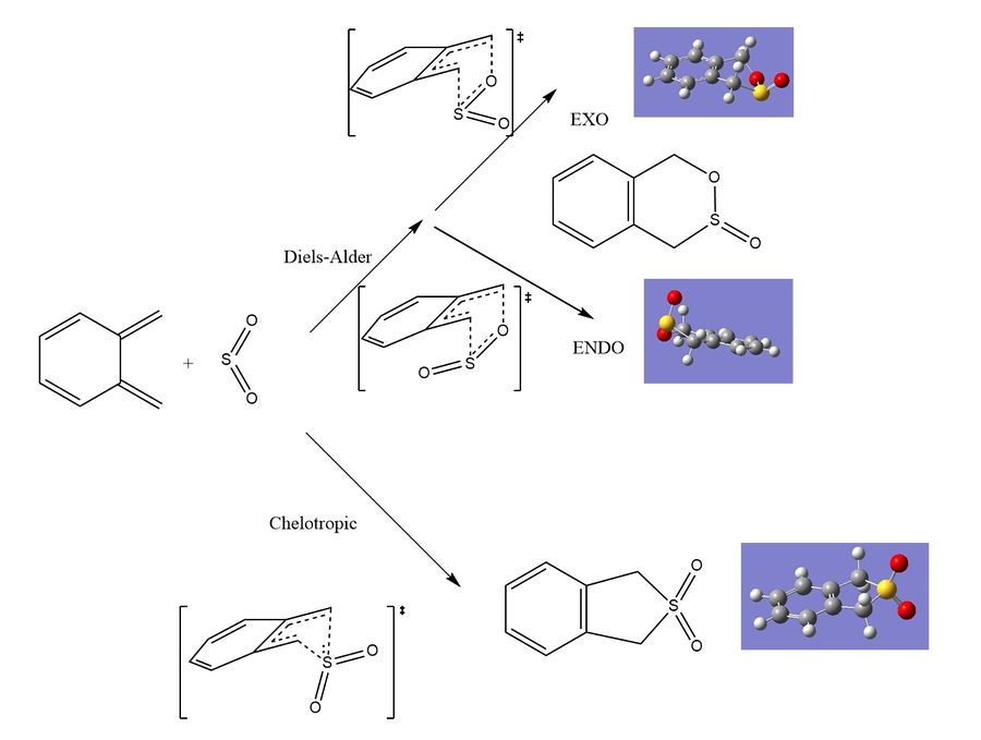 The final excercise looks again at the exo vs endo isomers but also considers a chelotropic reaction, by considering the energy of these reactions we are able to make predictions about which products formed and looking at the structures reationalise these predictions.
