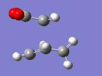 The transition structure for the Diels-Alder reaction was found using the freeze coordinate method and placing the terminal carbons 2.1Å apart and then using the method as detailed previously. This lead to the transition state below with a imaginary frequency of (-)525cm-1.