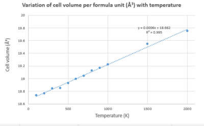 The gradient from the graph of cell volume versus temperature can be used to find a value for . Substituting this value into the equation for gives the value for the thermal expansion coefficient. This is equal to 3.096x10-5 K-1, which is extremely close to the literature value of 3.706x10-5 K-1[7] which was calculated over 300 - 2000 K.