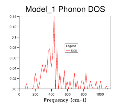 For a grid size of 1x1x1, the single k-point used to calculate the density of states was k() which corresponds to symmetry point L from the phonon dispersion. The peaks of the DOS graph are at frequencies of; 288.49, 351.76, 676.23 and 818.82 cm-1 (please refer to this log file: File:Vrt Harmonic approx111.out) which are identical to the frequencies of the bands at point L on the phonon dispersion. The reason that two peaks in the DOS graph have double the intensity compared with the other two is due to the convergence of 4 acoustic lines to 2 lines at this k-value.