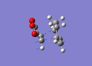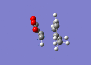 3)Two approaches were taken to locate the optimised cyclohexa-1,3-diene reaction with maleic anhydride transition structure. TSBerny method was not successful and thus , frozen coordinate method was used and was sucessful.TS Berny method failed probably because the overall geometry of transition structure is too complicated.Structure of both endo and exo transition structure of cyclohexa-1,3-diene reaction with maleic anhydride are as below.