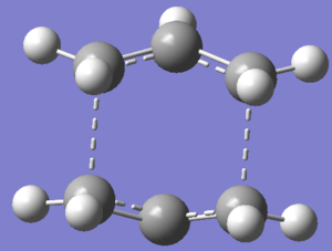 The dashed line shown in above image is the partly formed σ C-C bonds in the TS which is found to be 2.12A°.The both bonds form are similar which shows thaye are formen simultaneously(4).Since the geometry of the transition state resemble the reactants, it is called as the early transition state. A typical sp3-sp3 bondlength is 1.54A°(5) and sp2-sp2 bondlength is 1.47A°(5).The Van der waal radii is 1.70A°(5).The bond formed are longer than these typical bond length which confirms that it is the trasnition state and it is just the starting of forming sigma bond.However, it is still shorter than the Vanderwaal diameter due to to intermolecular orbital interaction which leads to further orbital overlap.The vibration which corresponds to the reaction path of the transition state and at lowest positive frequency are shown below.