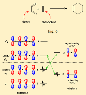 For the two compounds to react, a HOMO of one must react with the LUMO of the other with conservation of orbital symmetry. Hence,from looking at the HOMO and LUMO of both reactants using gauss view, it will appropriate for HOMO of cis butadiene react with LUMO of ethylene to form the MO shown above.This is because both of them have the same symmetry which is antisymmeteric(4). Hence, orbital overlap will be in phase. The image shown above proves the significant overlap of orbital to form the MO shown. Hence, the reaction is allowed. Below is a diagram which shows the interaction of HOMO of cis butadiene and LUMO of ethylene.