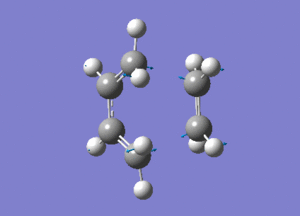 2)Several approaches were taken to locate the optimised ethylene+cis butadiene transition structure. TSBerny method and Frozen coordinate method were sucessful but QST2 method was not.This probably because the position of reactants placed were not similar to the end product.Frequency calculation was performed to characterise transition structure. An imaginery frequency at -954.34 confirmed the formation of the transition structure. Structure of the is as ethylene+cis butadiene transition structure is as below.