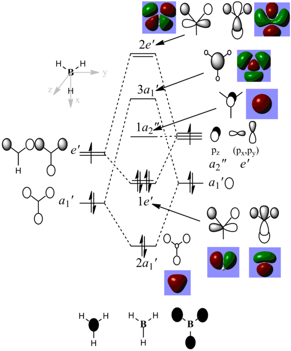 Comparison of bond lengths for all three optimised molecules shows unsurprisingly that there a relationship between the size of the molecule and bond length. Comparison of borane with boron tribromide allows us to observe the effect of changing the ligand for the same atomic centre. Hydrogen and bromine both have odd numbers of valence electrons, hence they both tend towards the formation of single bonds with other atoms. However the two atoms contrast hugely in size; hydrogen has just one electron and a small atomic radius, whilst bromine has a much larger atomic radius and seven valence electrons, including three lone electron pairs. The larger atomic radius also results in more diffuse atomic orbitals, reducing the strength of the overlap between orbitals during bonding, hence giving rise to weaker and thus longer bonds.