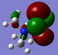 The charge range here is -0.750 to +0.750; areas of negative charge are represented in red, whilst areas of positive charge are shown in green (the brighter the colour, the greater the magnitude of charge). The specific NBO charge for the central nitrogen atom is -0.313; each of the carbon atoms on the methyl groups have a specific charge of -0.488, with the exception of the hydroxymethyl carbon which has a specific charge of -0.094. A significant proportion of the negative charge is also contributed by the oxygen atom with a specific charge of -0.707. The positive charge is distributed amongst the hydrogen atoms with each atom having a specific charge of +0.264 to +0.285, with the exception of the hydroxymethyl hydrogens; the alkyl hydrogens here have a specific charge of +0.234, whilst the hydroxyl proton has a specific charge of +0.532. The net effect of the specific charges sum to give 1, therefore the molecule is shown to have a +1 charge as expected.