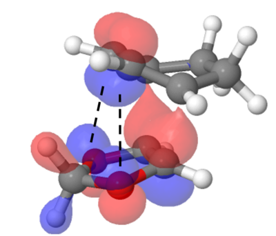 - In exercise 1, a [4+2] cycloaddition reaction between butadiene and ethylene is studied. It can be concluded that in order for molecular orbitals to interact, they have to have the same symmetry (symmetric and symmetric interaction or antisymmetric and antisymmetric interaction). Reactions with different symmetry (symmetric and antisymmetric interaction) is forbidden. The negative vibrational frequency of the transition state and IRC proved that this reaction proceeds via a concerted mechanism meaning the formation of new bonds are synchronous.