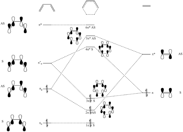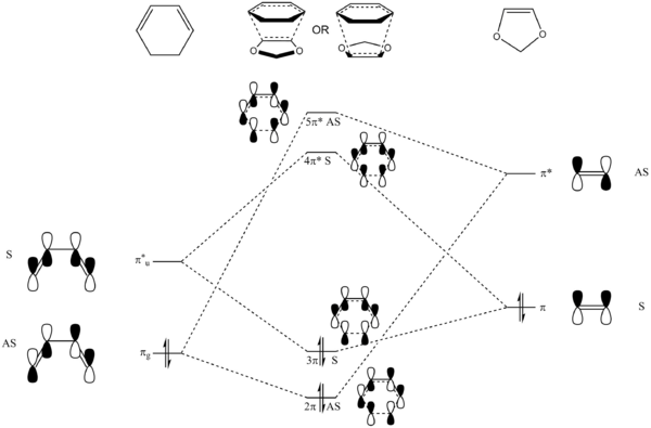 (Fv611 (talk) The MO diagram is correct in the pairings that you have selected, but from the MOs you have calculated, you know that the energies of both the butadiene HOMO and the ethene HOMO are lower than that of the TS HOMO-1, so why not draw them that way? Similarly, you know from your calculated MOs that the energy of the ethene LUMO is higher than the LUMO+1.)
