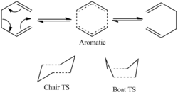 The Cope Rearrangement reaction has been long established as a pericyclic reaction ([3,3]-sigmatropic shifts). However its reaction mechanism remains a controversial topic. The concerted rearrangement reaction is considered to have two different possible transition state, either the aromatic transition state or the diradical transition state.[1] The aromatic transition state is shown in Figure 1 and has two conformations: the chair and the boat.