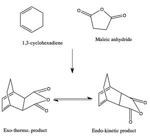 - The structural difference between the endo and exo TSs can be considered if the maleic anhydride fragment remains constant in the plane, rotating the cyclohexadiene around its centre of mass by 180 degree.