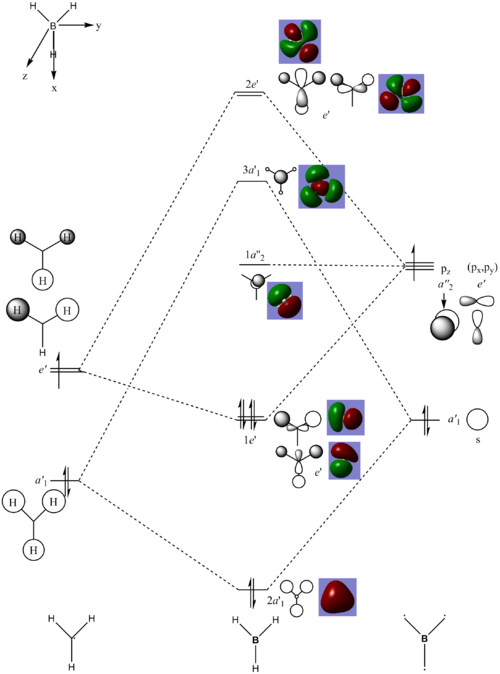 A BH3 molecule was created, and the three B-H bond distances was changed to 1.53 Å, 1.54 Å and 1.55 Å respectively. Geometry optimization was carried out by Gaussian using B3LYP method and 3-21G as basis sets.