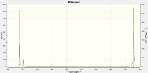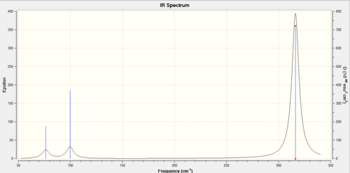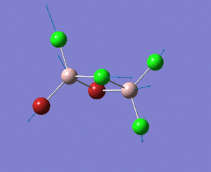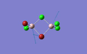 In the third set of modes, we are comparing the motion of two terminal bromides and two bridging bromides. Surprisingly, the Gaussian analysis indicates two terminal bromides stretchings have lower frequency than two bridging bromide stretchings. This is in contrast with the fact that Al-Br bond is weaker. So I suggest that terminal Al-Br bond is stronger than bridging Al-Br bond because in bridging structure, long pair on bromide is donated to the adjacent Al, lowering the bond order of original Al-Br. Some vibration mixing may occur, and the energy may not be in the same order as expected.