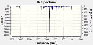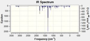 An unusual peak is reported for product 2 in the literature at 3438cm-1 which cannot be correlated to any peak in the calculated spectrum, whose highest energy peak is reported at 3229cm-1 for a C-H stretch. Judging from the calculated spectrum and based on the fact that the computational method over-predicts the vibrational energy by about 100cm-1 , it would appear that this stretch in the literature corresponds to some sort of impurity in the sample, possibly water contamination.