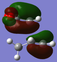 The Diels-Alder reaction is a pericyclic reaction which takes place between a diene and a dienophile. During the reaction 2π bonds are broken and two σ bonds take their place. It has been suggested in literature that the stability of the transition state is due to the presence of six delocalised electrons resulting in aromatic character. There are two possible outcomes for the Diels-Alder reaction, either the exo or the endo product. The exo product is considered to be more stable and is therefore formed in a reversible reaction under thermodynamic conditions. The reason for this stability is thought to be the interactions between the HOMO of the diene and the LUMO of the dienophile (fig.15) as it has been suggested that in the endo form the p-orbitals are orientated with the correct symmetry and overlap to be able to stabilise and aid the formation of the endo product.[7] In this investigation two Diels-Alder reactions; namely the reaction of ethene and cis-butadiene and the reaction of cyclohexadiene and maleic anhydride, will be considered in terms of their transition states and molecular orbitals (MOs).