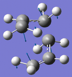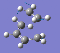 The two lowest frequencies, imaginary and lowest positive (animation 7 and animation 8 - File:DA TS 1 OPT FREEZECOORD AM1 P2 3.chk), can be compared. The imaginary frequency shows that the Diels-Alder reaction path is synchronous as the two bonds are being formed/broken simultaneously. This appears to be in contrast to the lowest positive frequency which is asynchronous with the two bonds in question forming/breaking alternatively.