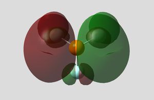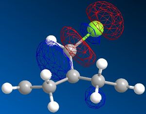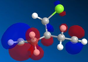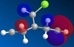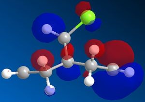Pre-optimisation of the geometry of 12 using the MM2 force field followed by a quantum mechanical treatment; MOPAC/PM6 method generates an approximate representation of the valence-electron molecular wavefunctions. The HOMO, HOMO-1, LUMO, LUMO+1 and LUMO+2 are shown. This method discriminates between the two alkenes. The HOMO indicates that the alkene endo to the chloro group (underneath the chlorine) is the most nucleophilic as the PM6 calulation of this orbital has a larger coefficient at this alkene compared to the one anti to the Cl group.This agrees with experiment [5] which shows that electrophilic addition occurs regioselectivity at this alkene double bond. Attack is also found to take from the face opposite the bridge presumably because of sterics. The explanation given [6]is that there is an interaction between the exo (anti) pi bonding orbital and the carbon of the C-Cl sigma antibonding orbital (a so called negative sigma conjugation or hyperconjugation). These two orbitals are in an antiperiplanar arrangement (app). The C-Cl sigma antibonding orbital is represented by the LUMO+1 and the pi bonding orbital of the exo alkene by HOMO-1. The phases are clearly correct for orbital overlap(overall integral). This stabilising interaction effectively removes some electron density from the exo pi orbital (and into the sigma orbital of the C-Cl bond) lowering its energy relative to endo. (HOMO-1 more delocalised). It is also predicted that the anti (or exo) double bond will distort towards the bridgehead due this stereoelectronic effect. In fact when the PM6 calculation is run this distortion can be observed.