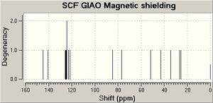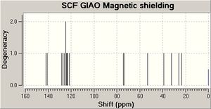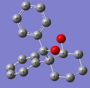 Tu et al [7] report the stereoselective reductive rearrangement of several epoxides with aluminium isopropoxide (AIP), namely that of 2-(1-hydroxy-1-phenylcyclohexanol) to give the 1,3-diol product as a mixture of C1 diastereoisomers.The Lewis acidic AIP reacts with the alpha hydroxy group of the epoxide. The resulting intermediate then undergoes a semi-pinacol rearrangement followed by a Meerwein-Pondorf Verley type reduction. The resulting products each contain three stereoenic centres. Only the stereochemistry of the hydroxyl group at carbon 1 differs between the two isomers. Tu et al found and 80:20 mixture of the diastereoisomer with the phenyl on carbon 2 and the hydroxyl at position 1 in the syn arrangement relative to the C1-C2 anti isomer. They identified the stereochemistry of the products using a technique of 1H-1H-NOESY. Irradiation of the hydrogen at C1 would be expected to show a strong NOE (large signal enhancement) to the hydrogen at C3 in the minor (anti) isomer indicating that they are on the same of the molecule. The NOE to the same hydrogen in the major isomer would be expected to be weaker as they are further apart[8]. The geometries of both stereoisomers were fully optimised at the mpw1pw91/6-31(d,p) level. Rotation about the C1-C2 single bond could give rise to several conformations. However, the preferred conformation places the two phenyl groups as far apart as possible presumably on the grounds of sterics. The preferred conformation for the cyclohexane ring is the chair (as above). The 13 C NMR cehimcal shifts were calculated (table 3) using the GIAO approach. This uses quantum mechanical density functional theory. One drawback is that it is conformational sensitive.