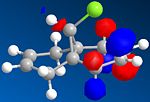 Compound 12 reacts with dichlorocarbene similarly to an electrophilic addition. Since the size of the substituents, H and cl, on the bridge are relatively small, sterics do not play a major role in determiniing which of the two alkenes will react. We must look at electronic effects in order to determine the more reaction alkene. The HOMO alkene will be the most nucleophilic because the electrons with be concentrated there and hence the alkene will be more reactive with dichlorocarbene. In addition there are antiperiplanar interactions between the C-Cl signa-star orbital and the occupied pie orbiral on the alkene away from the chlorine side which makes it more stable than the alkene on the chlorine side. The method clearly shows discrimination between the two alkenes. MOPAC/PM6 molecular orbital approximation shows the HUMO residing on the alkene on the chlorine side and hence reaction is expected to occur with this alkene. This is supported by the calculated stretching frequencies of the alkenes with the HUMO residing alkene having a higher energy than the other.