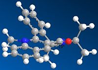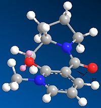 As can be seen from the table below the optimum dihedral angle for the carbonyl group in the 7 membered ring is 22, as can be seen from the image this relates to the carbonyl stretching up onto the opposite face to the adjacent methyl group. This provides a good explanation for the geometry of the product as both the carbonyl group and the NHPhenyl group coordinating with the pyridinium ring have large electron deinsity which will repel each other, therefore the NHPhenyl group will coordinate on the oppisite face to the carbonyl, therefore based on the proposed geometry of the start material it will eb expected to coordinate on the same face as the mathyl group, this prediced relationship is in agreement with the structure of molecule 8.