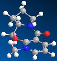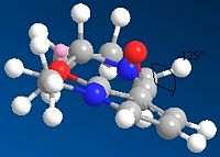 In this part of the investigation the relative energy values of Prolinol were studied in relation to the dihedral angle between the carbonyl group and the 4-position on the pyridine ring. This was achieved by creating the reactant molecule in ChemBio3D and minimising the energy using the MM2 force field, this was repeated for several different geometries until the lowest was found. The geometry of the reactant can then be compared to the geometry of the product and a reasonable mechanism for the reaction suggested.