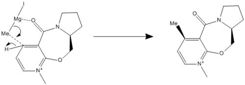 As the most favoured ground state for the prolinol molecule is that with the carboxy group pointing out of the plane in the same direction as the puckering of the seven membered ring, therefore the grignard reagent coordinates on this site and the methyl group will attach to the 4 position of the Pyridine ring on this face.