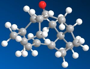 As can be seen in the produced images, one of the main differences between the two molecules is that molecule 9, in order to produce a carbonyl which faces 'upwards' in the same face as the bridging group must adopt a relatively unstable twist boat conformation in the 6 memebred rign whereas the geometry of the carbonyl group in molecule 10 allows the six memebered rign to form the less sterically and torsionally strained chair conformation. This is reflected in the relative energies discussed above and seen in the table below.