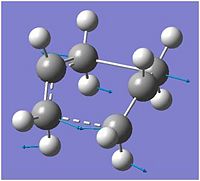 The HF/3-21G Boat transition state was optimised and its frequencies calculated at the B3LYP/6-31G* level in the same way as the chair transition state above[25][26].
