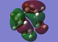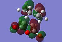 The HOMO of the transition state reflects the movement of electrons in the Diels-Alder reaction. In this system, this reaction is allowed as the conditions and number of electrons gives the final product, cyclohexene. The conditions fulfilled are that there are a total of 6π electrons, a supposed themral conditions (due to a change in temperature from 0K to 298.15K), which leads to the reaction proceeding under Huckel topology, leading to a product with suprafacial components. The orbitals involved, which can be seen in the optimisation of the reactants at the beginning of the Diels-Alder section of this report, causes the formation of bonds over the similar faces of the π systems of both starting materials.