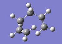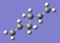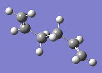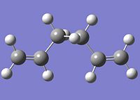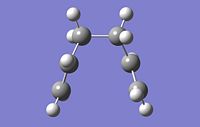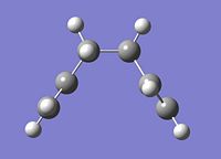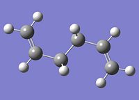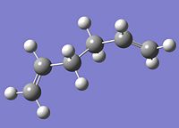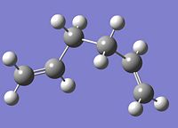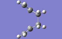 In the following exercise, the anti conformation of 1,5-hexadiene was first optimised using the HF/3-21G method. Following the instructions, the symmetry of the conformation was found using the symmetrize function found on GaussView5. The energies and point group were then recorded. This was also carried out on the gauche conformers, and the relevant values recorded.