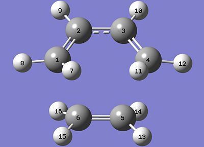 In this section, a prototypical reaction between butadiene and ethylene is first studied, and then the reaction between 1,5-hexadiene and maleic anhydride is subsequently studied. The Diels-Alder reaction is a concerted reaction between the terminal C=C of a diene and a C=C double bond, also known as a dienophile. The following computational calculations are carried out to observe the transition structures, which will lead to the most stable major product.