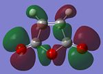 The information shown in the table above depicts the bonding on the HOMO and LUMO levels for both conformers, but do not give a conclusive reason for the extra stability found in the endo conformer. As a result, a search of the HOMOs for the endo product reveals that a secondary orbital interaction exists for the C-H σ* orbital and the orbitals on the side groups of the alkene in the HOMO-12 of the endo conformer. This leads to an orbital mixing which causes its increased stability. The diagram below demonstrates the orbital interaction as described. In contrast, the HOMO-12 orbital of the exo conformer does not have the other secondary interaction with the forming C-C σ bond, compared to the interaction found on the endo conformer. The first image containing the endo conformer has circles drawn and an arrow connecting them to emphasize the secondary interaction which leads to extra stability. The second image containing the exo conformer has a circle drawn to emphasize the lack of interaction within the maleic anhydride ring for enhanced stability. Additionally, from section 3.3.3.4 the distance between both reactants, atom C6 to C11 for the endo and C2 to C11 for the exo conformer, the smaller distance observed in the endo conformer suggests that the secondary interaction is much stronger than the interaction observed in the exo conformer.