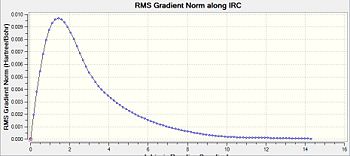 For an IRC to have reached the minimum geometry, the path would have to undergo a plateau which means that it has reached an RMS gradient of zero. From entry 2, it can be observed that the IRC has indeed reached a minimum close to zero, which allows for the use of the IRC calculations to draw a link between the transition state and a conformer whose energy and geometry highly resembles that calculated by the IRC. In this case, the conformer that the calculations from the IRC has obtained resembles gauche-3, found in table 1. Comparing their energies, the energy obtained from the IRC calculation, -231.69166a.u. is very close to the optimised conformer gauche-3, at -231.69167a.u..