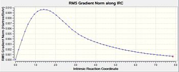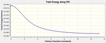 Following the optimisation, the reaction pathway was followed using the IRC calculation. In this calculation, different conformers of the 1,5-hexadiene, some of which are found in table 1, are connected to the transition structure optimised in the section above. This particular IRC calculation was carried out in the forward direction with 50 steps for calculation number 1. In the second calculation, the number of steps was increased to 150 in order to see whether the minimum geometry had been reached in the first calculation. From table 5, the second calculation did serve to find a minimum geometry that was much more optimised compared to that seen in the first geometry.